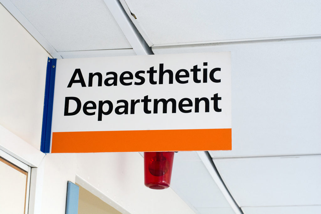 ← → A sign to the anaesthetic department in a hospital. Anaesthetic’s are used to sedant patients prior to major surgery.
